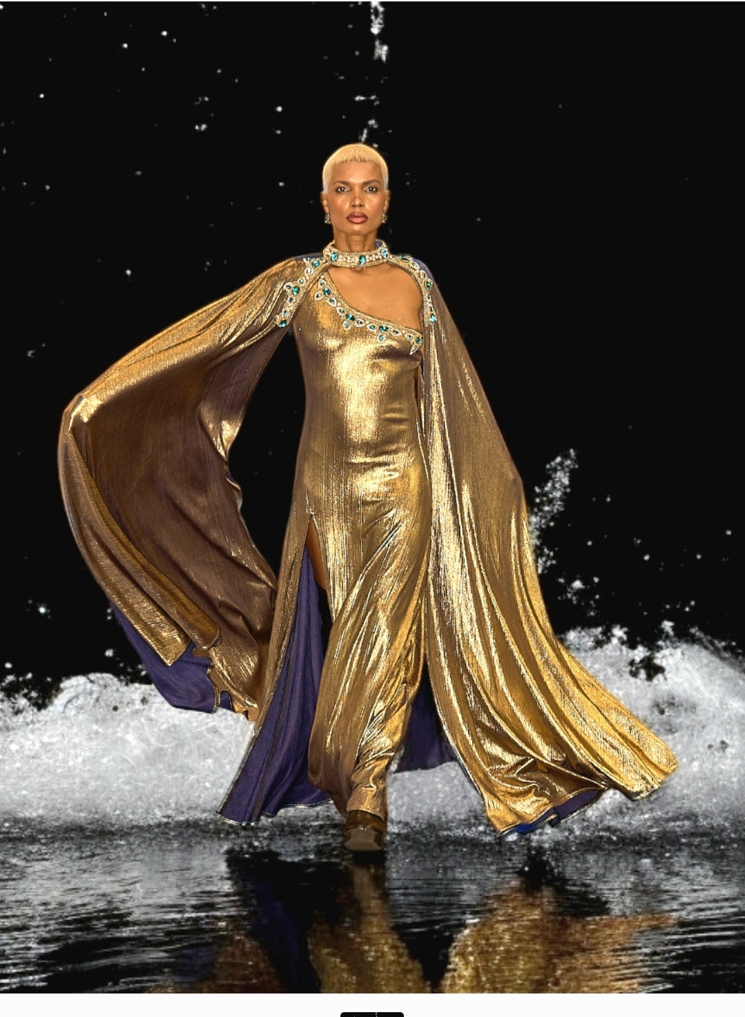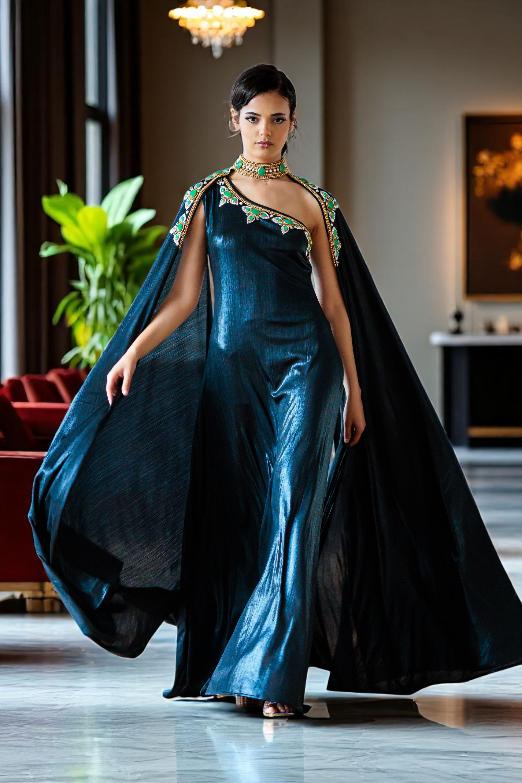 Designer cut one shoulder dress shaped for a perfect fit. Made in beautiful Metallic crepe fabrics adding to it the required texture and flow. The neck is embellished with hand done bead work and crystals. The two sided cape with hand beading gives a royal touch to the ensemble. Available in variety of metallic fabric colors.