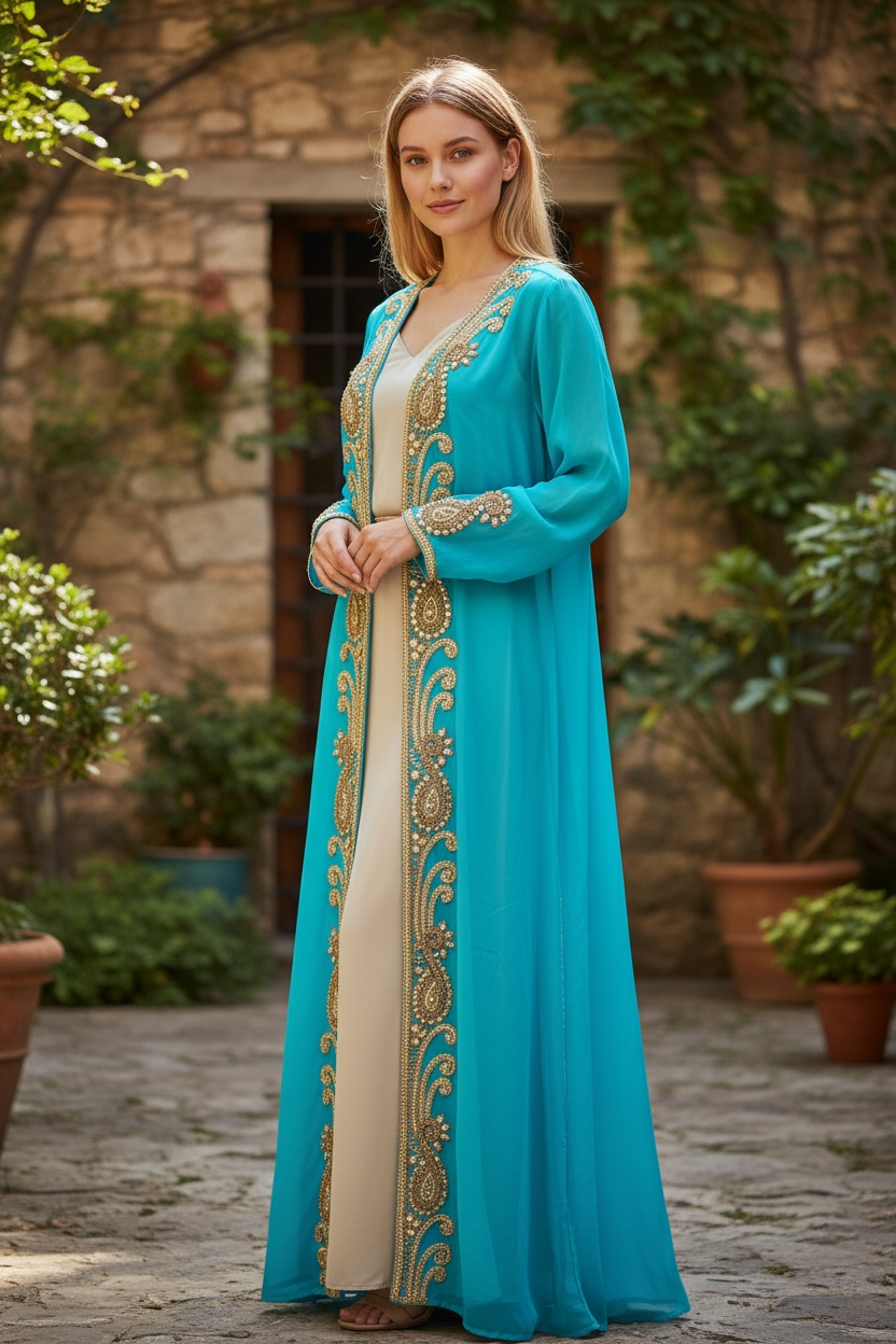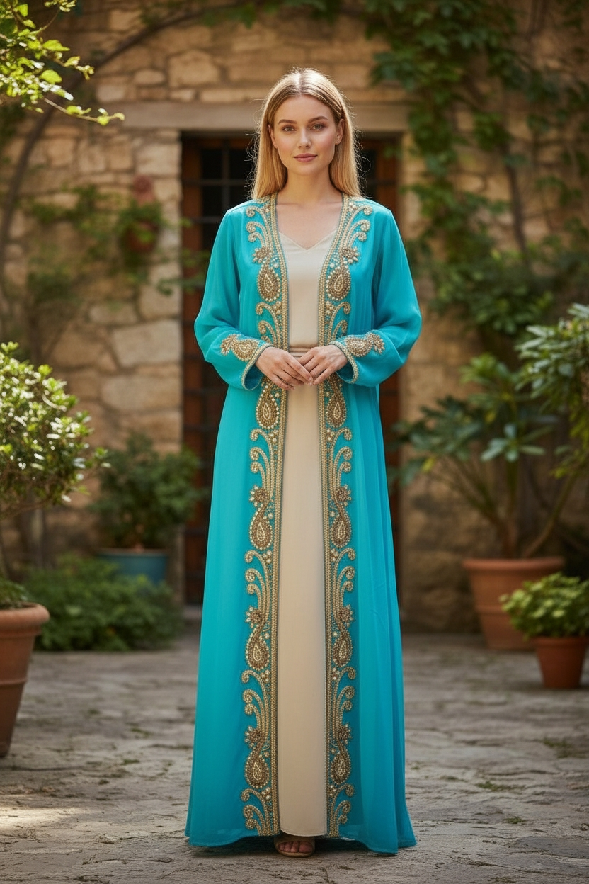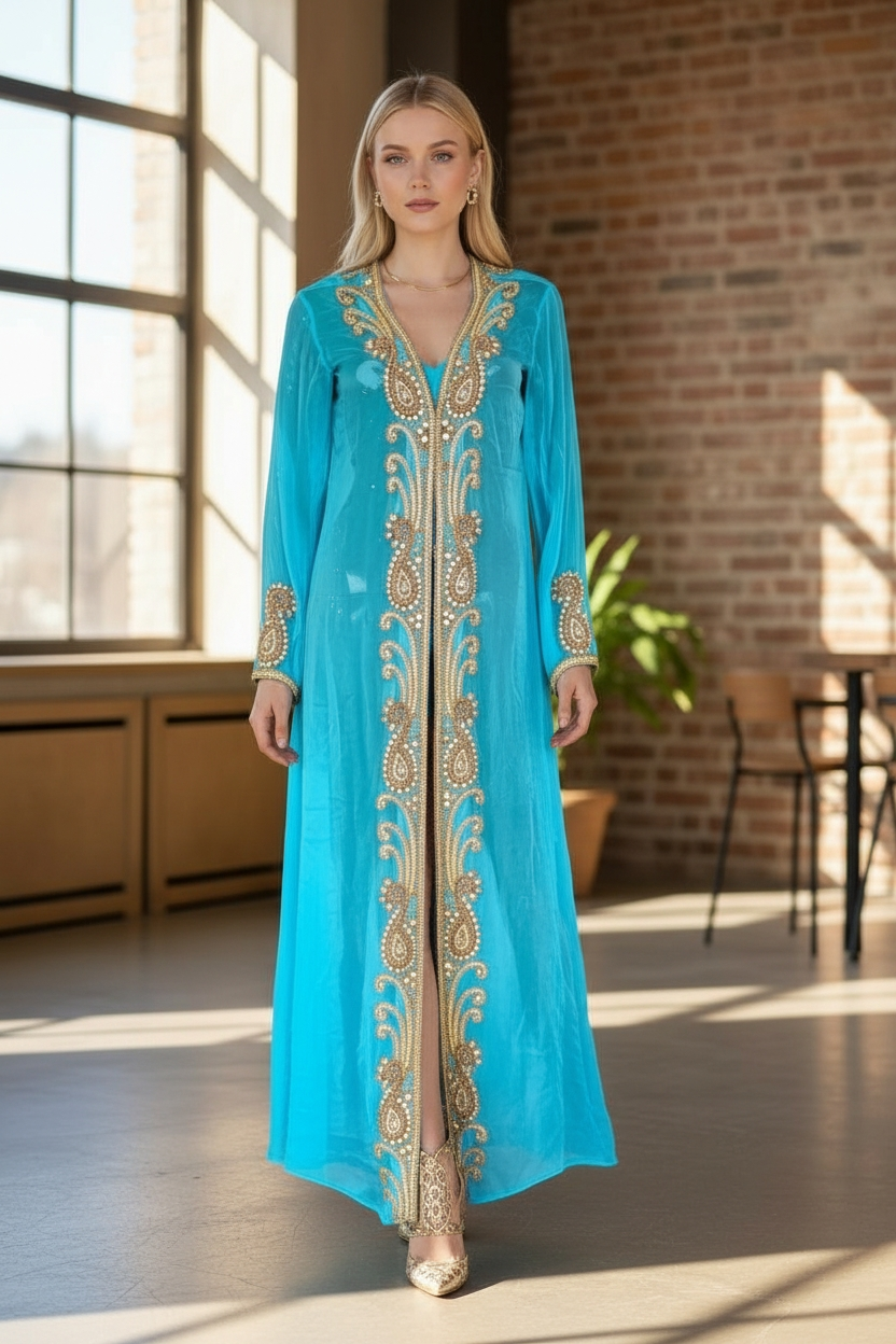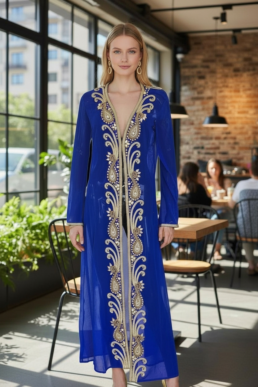 Long hand beaded cape in sheer viscose georgette fabric to match the amazing collection of swim suits. Add glitter, shine and class to a memorable