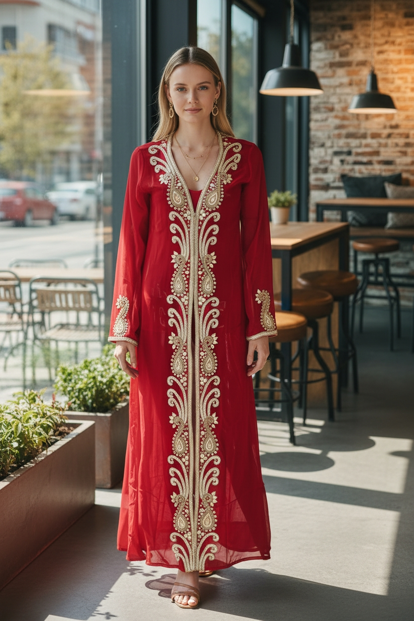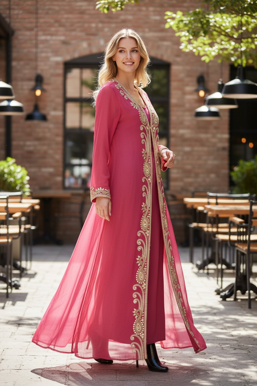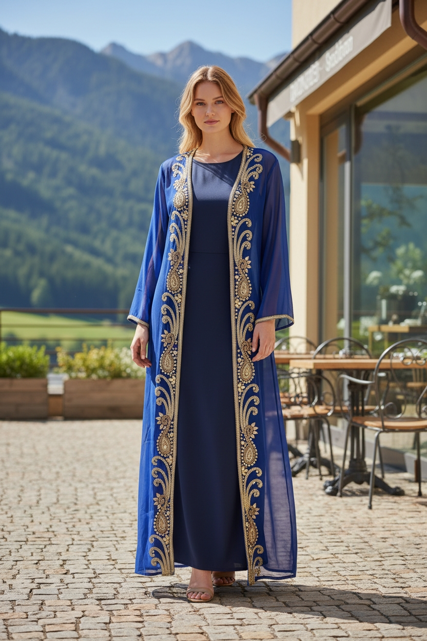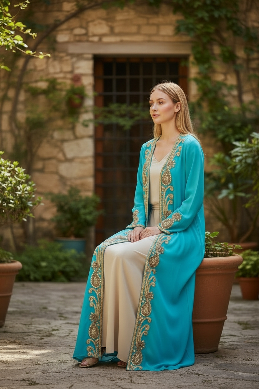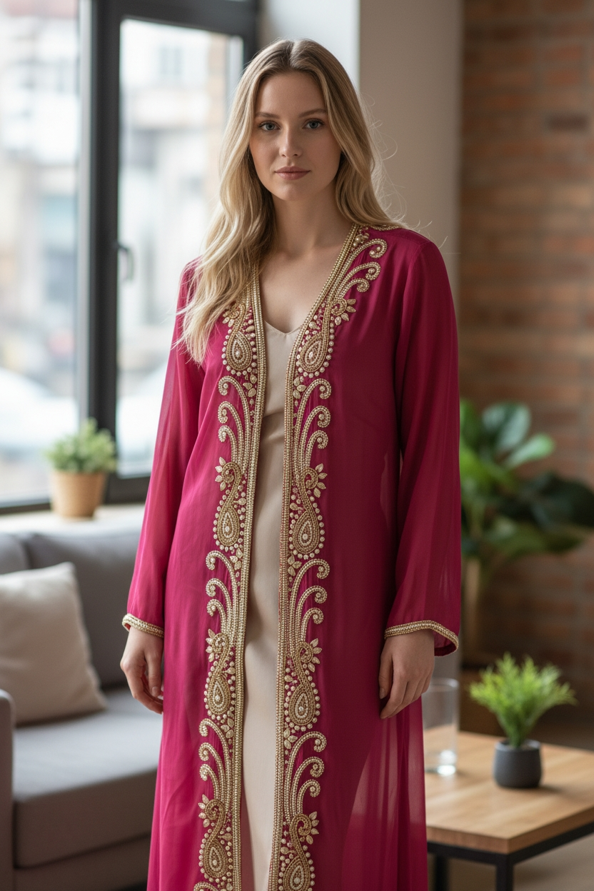 Long hand beaded cape in sheer viscose georgette fabric to match the amazing collection of swim suits. Add glitter, shine and class to a memorable