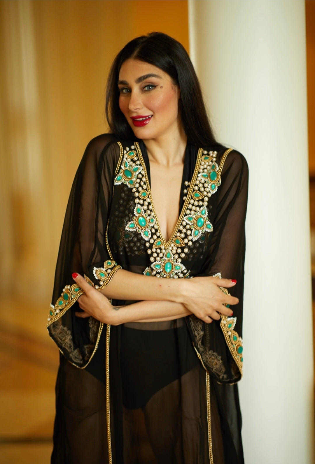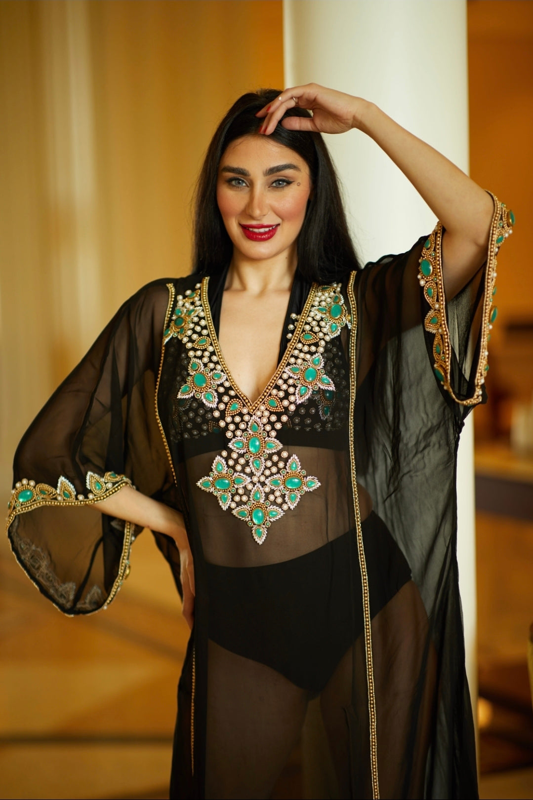 Hand beaded Long Kaftan in sheer viscose georgette fabric.