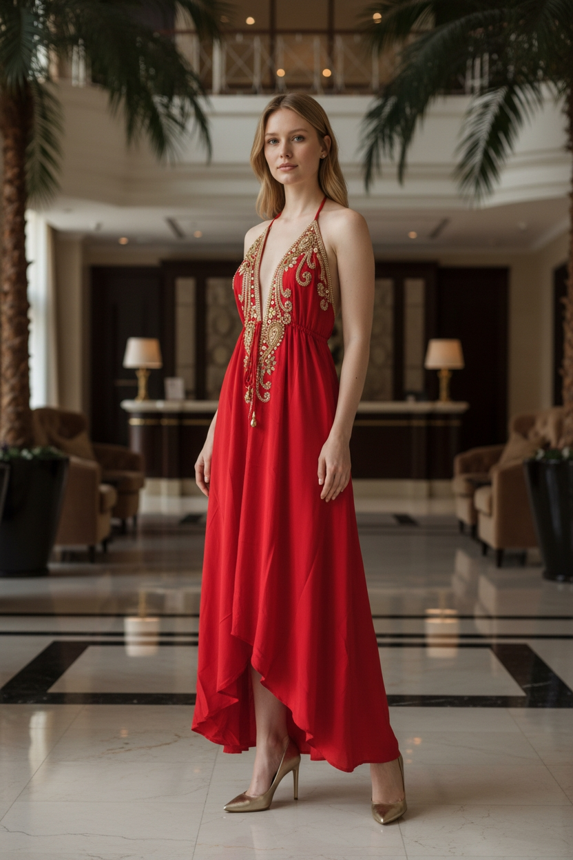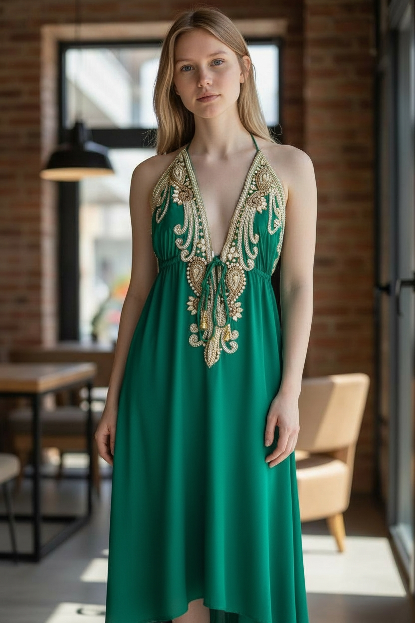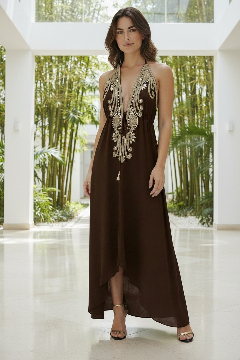 Designer cut hi lo dress with mid string for a perfect fit. New CAPRI golden embellished halter neck dress in beautiful viscose crepe fabric adding to it the required texture and flow. The neck is hand embellished with golden beads and colored matching the dress. Available in other rich solid colors. Great wear for resort, holiday and special occasions.