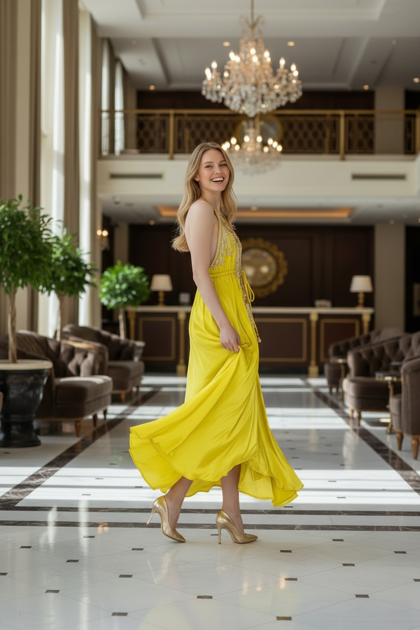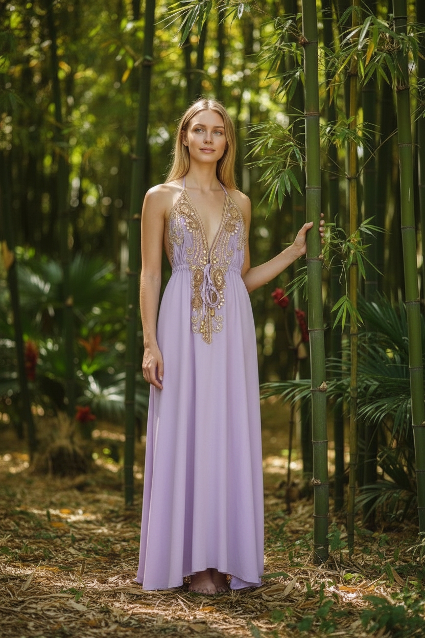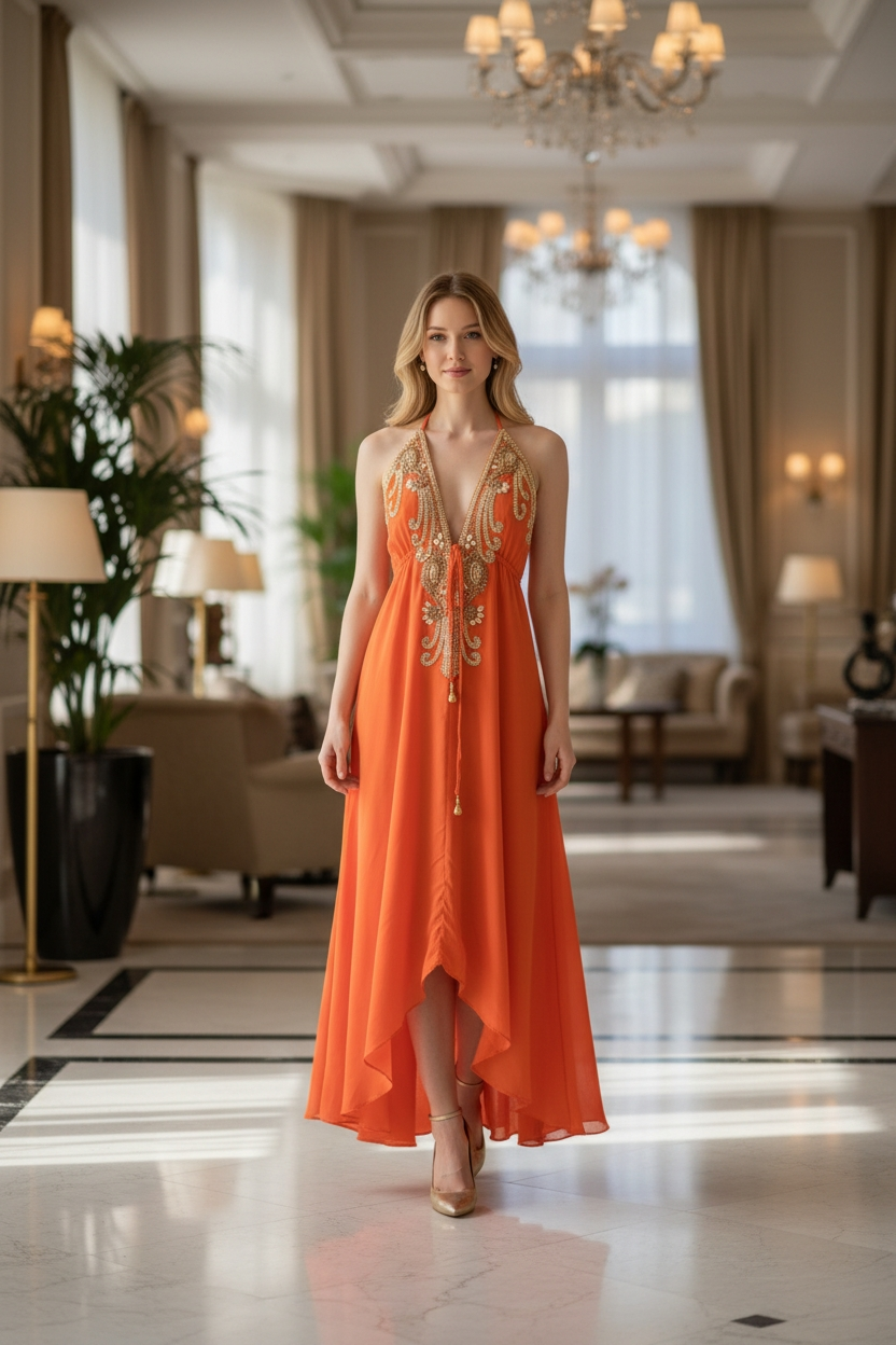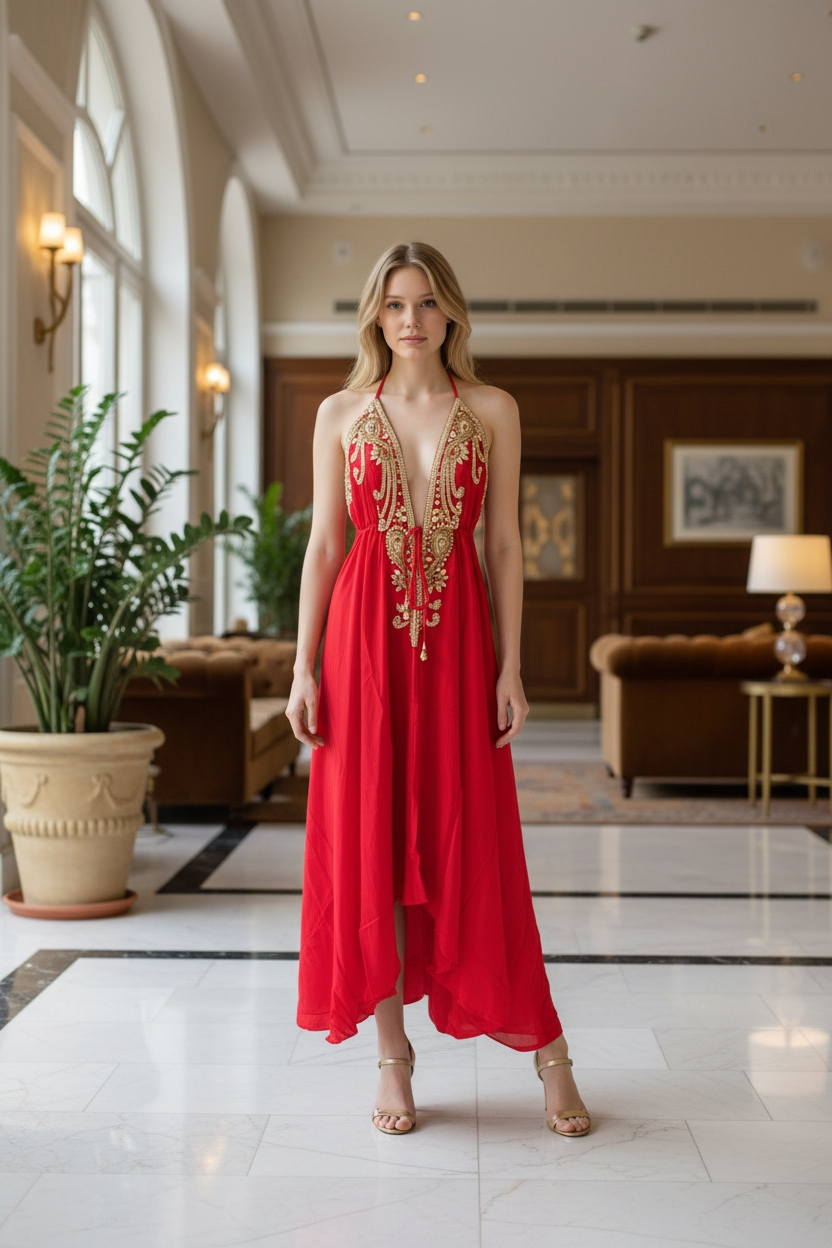 Designer cut hi lo dress with mid string for a perfect fit. New CAPRI golden embellished halter neck dress in beautiful viscose crepe fabric adding to it the required texture and flow. The neck is hand embellished with golden beads and colored matching the dress. Available in other rich solid colors. Great wear for resort, holiday and special occasions.